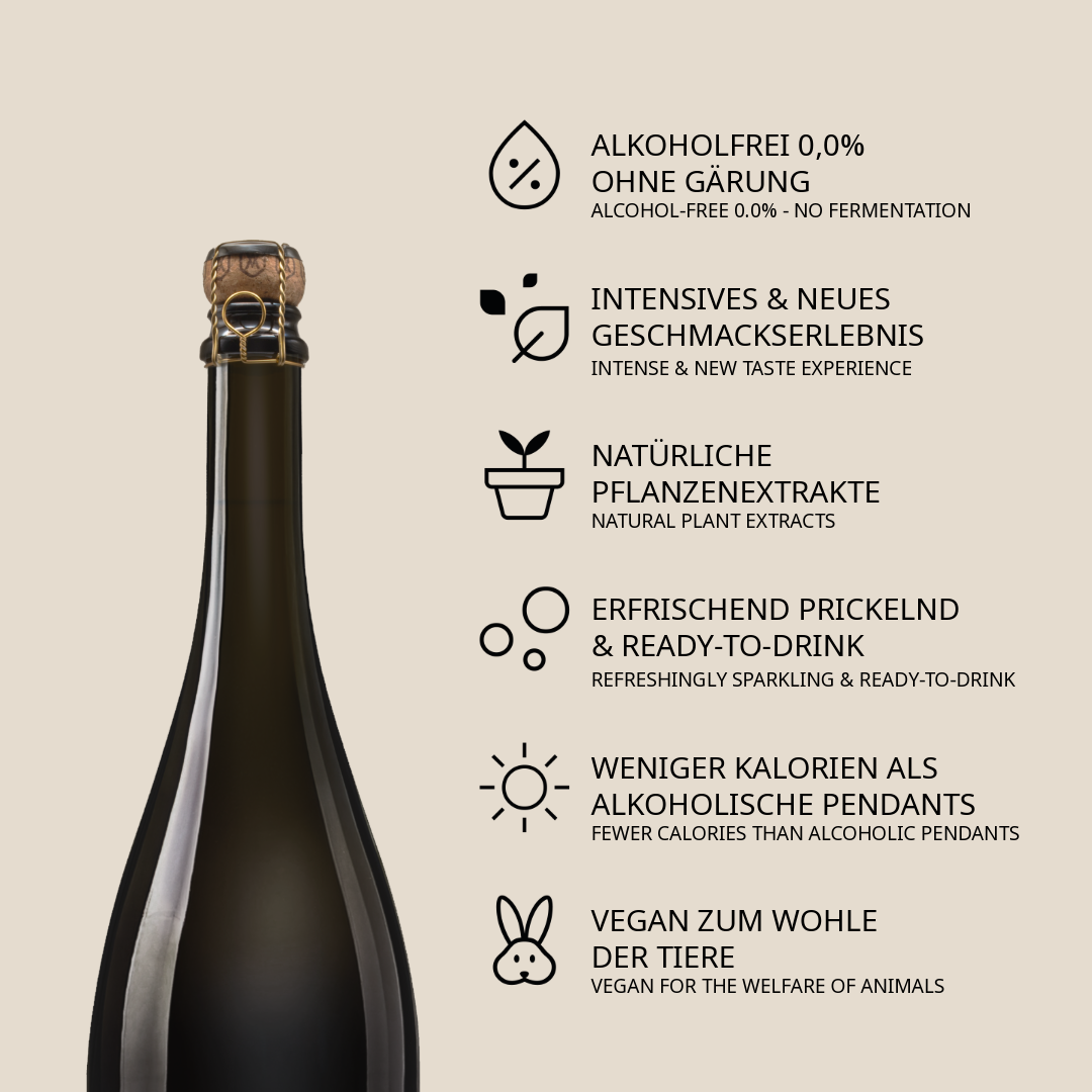 ROSE begeistert mit feiner Blumigkeit, BUCCO mit exotischem Charme und JUNIPER mit markanter Aromatik. Alle Sorten basieren auf natürlichen Pflanzenextrakten und verbinden feine Bitternoten und komplexe Aromen mit intensivem Geschmack. Ohne Gärung – 0,0 % Vol. Pur, auf Eis oder gemischt mit einem Spritzer alkoholfreiem Sekt oder Gin. Ideal zum Probieren, für besondere Momente und als exklusives Geschenk.